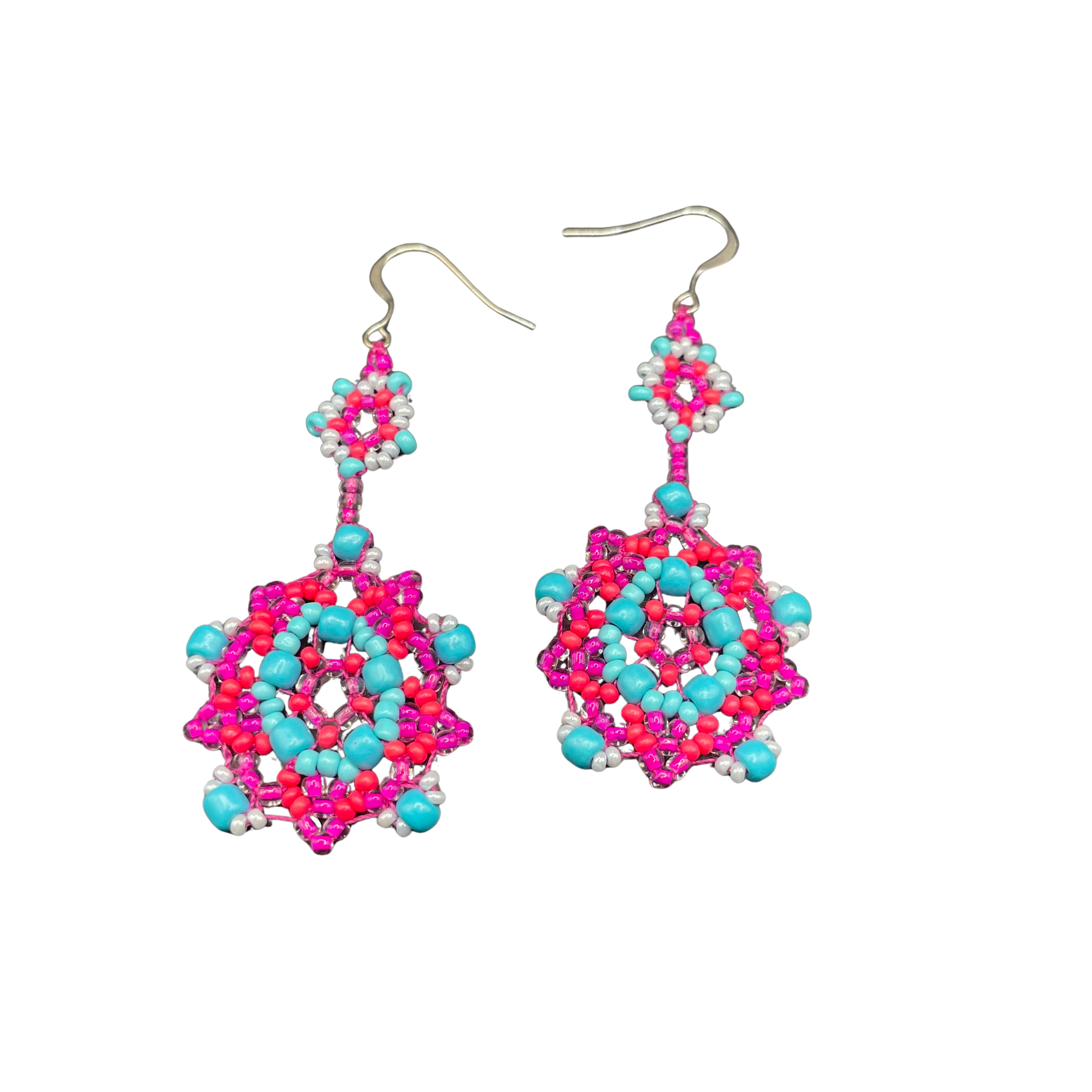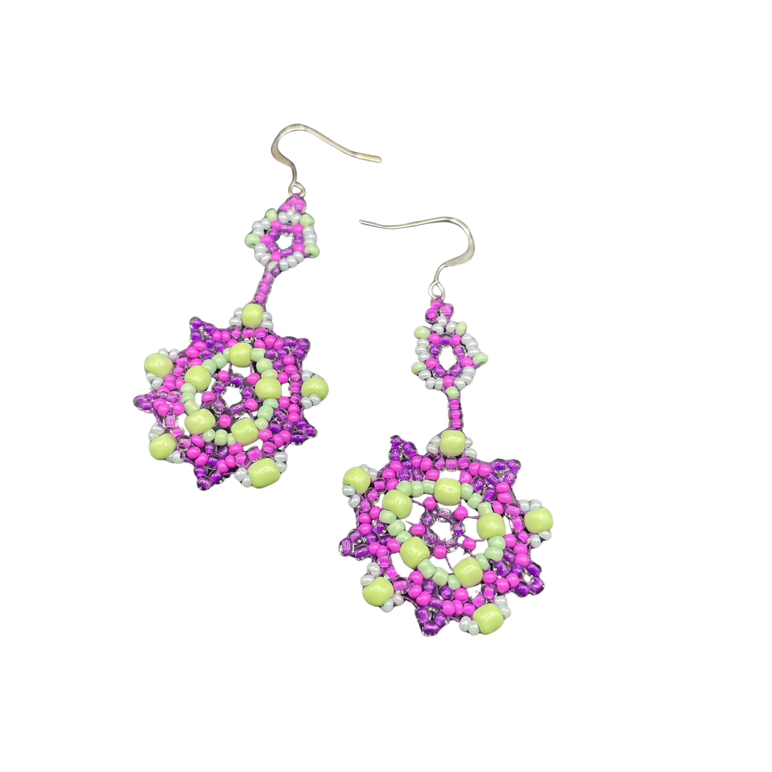 Shop › Funky Floral Earrings Image 1 of 2 Image 2 of 2 Funky Floral Earrings $50.00 Designed & handmade by Grace Weine.Sterling silver hooksThreadGlass beads Color: Green & Purple Blue & Pink Quantity: Add To Cart Added! Designed & handmade by Grace Weine.Sterling silver hooksThreadGlass beads
